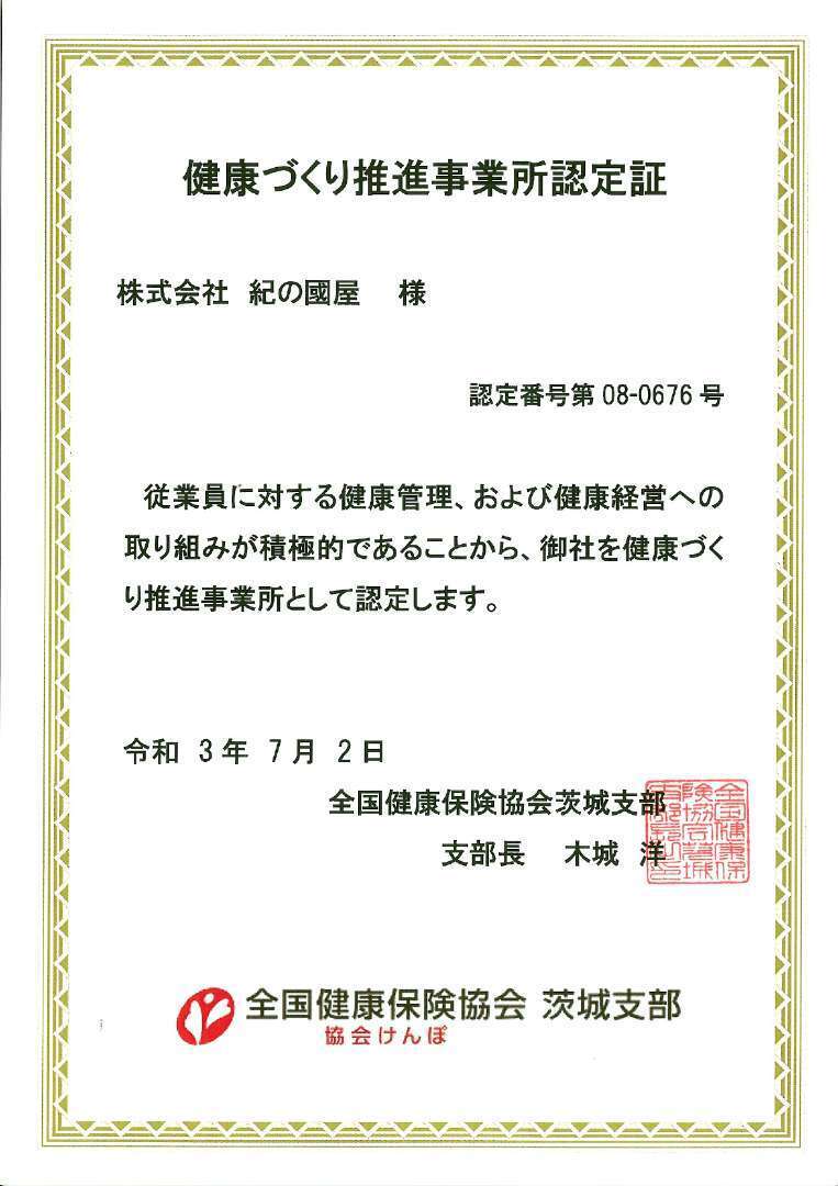 このたび、協会けんぽ茨城支部様より「健康づくり推進事業所」に認定されました。